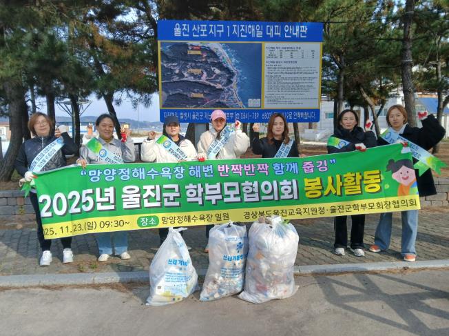 [메이저뉴스]울진교육지원청은 11월 23일 09시 30분 “먕양해수욕장 해변 반짝반짝 함께 줍깅”이란 슬로건 아래 '2025년 울진군 학부모장협의회 봉사활동'을 실시했다.
