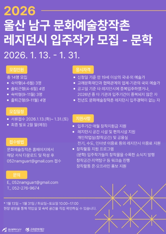 [메이저뉴스] 고래문화재단이 운영하는 울산 남구 문화예술창작촌이 2026년도 레지던시 사업에 참여할 입주작가를 1월 13일부터 1월 31일까지 공개 모집한다.