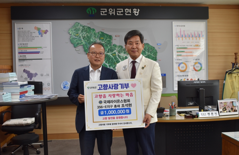 [메이저뉴스]군위군은 국제라이온스협회 356-E(경북)지구 조석현 총재(제38대)가 지난 23일 군위군청을 방문하여 고향사랑기부금 100만원을 전달했다고 밝혔다.