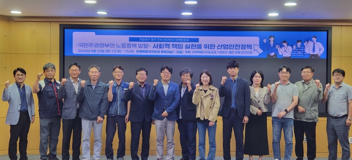 [메이저뉴스]전북특별자치도의회 의원 연구단체 ‘기업하기 좋은 전북’(대표위원 서난이)은 23일 전북자치도청 중회의실에서 ‘사회적 책임 실현을 위한 산업안전정책 모색’이라는 주제로 정책토론회를 개최했다. 이번 토론회는 이재명 국민주권정부의 안전한 일터 만들기에 발맞추어, 전북자치도의 대응 방향을 모색하기 위해 마련됐다.