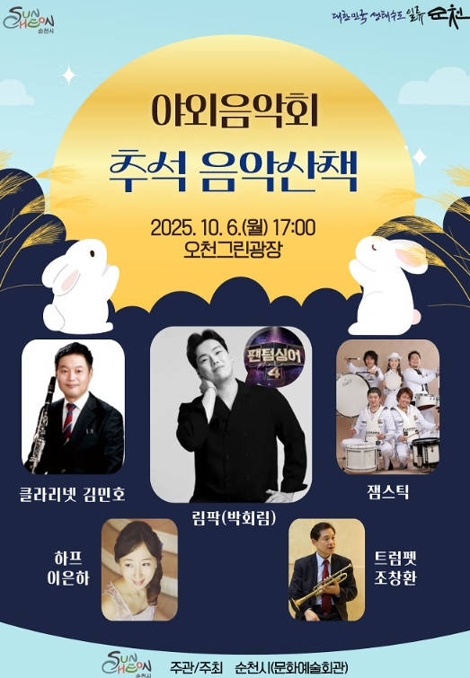 [메이저뉴스]순천시 문화예술회관은 추석 명절을 맞아 시민과 관광객을 위한 야외음악회 '추석 음악산책'을 10월 6일 추석 당일 오후 5시에 오천그린광장에서 개최한다고 밝혔다.