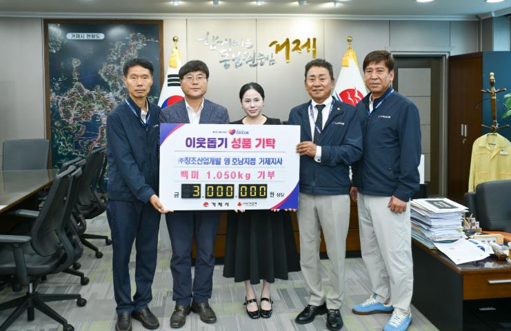 [메이저뉴스]㈜창조산업개발 영·호남지점 거제지사는 9월 29일 거제시청을 방문해 백미 1,050kg 약 300만 원 상당을 기탁하며 지역사회를 위한 따뜻한 나눔을 실천했다.