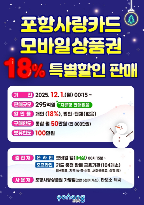 [메이저뉴스] 포항시는 연말 지역 소비 촉진을 위해 내달 1일부터 카드형·모바일 포항사랑상품권(이하 포항사랑카드)을 295억 원 규모로 18% 할인 판매한다.