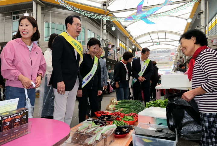 3일, 송 군수는 괴산전통시장 곳곳을 돌며 제철 농산물과 수산물 등을 직접 구입하고, 상인들과 일일이 악수하며 현장의 생생한 목소리를 청취했다.