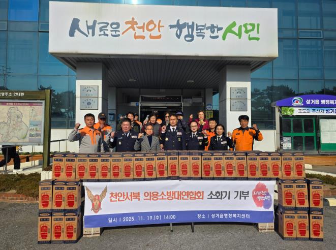 [메이저뉴스]천안서북소방서는 19일 14시, 의용소방대연합회와 성거읍 남·여의용소방대가 함께 성거읍행정복지센터에 소화기 50대를 전달했다고 밝혔다.