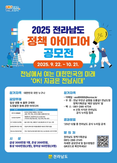 [메이저뉴스]전라남도가 새 정부의 실용주의 기조에 맞춰 ‘생활 속 불편을 찾고 이를 개선할, 지역의 미래를 먹여 살릴 정책’을 주제로 ‘2025년 전라남도 정책 아이디어 공모전’을 개최한다.
