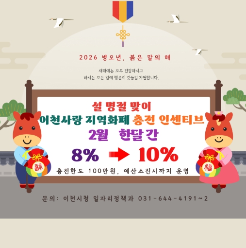 [메이저뉴스]이천시는 설 명절을 맞아 지역경제 활성화와 소상공인 매출 증대를 위해 2026년 2월 한 달간 이천사랑지역화폐 충전 인센티브를 기존 8%에서 10%로 상향한다고 밝혔다.