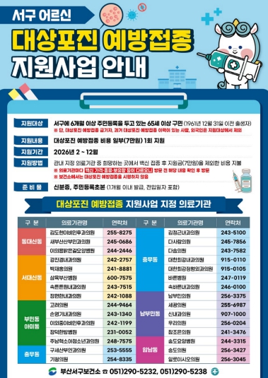 [메이저뉴스]부산 서구는 올해 65세 이상 어르신들을 대상으로 대상포진을 예방하고 노년기 삶의 질 향상을 도모하고자 대상포진 예방접종 지원사업을 오는 2월부터 서구 관내에 첫 도입한다.