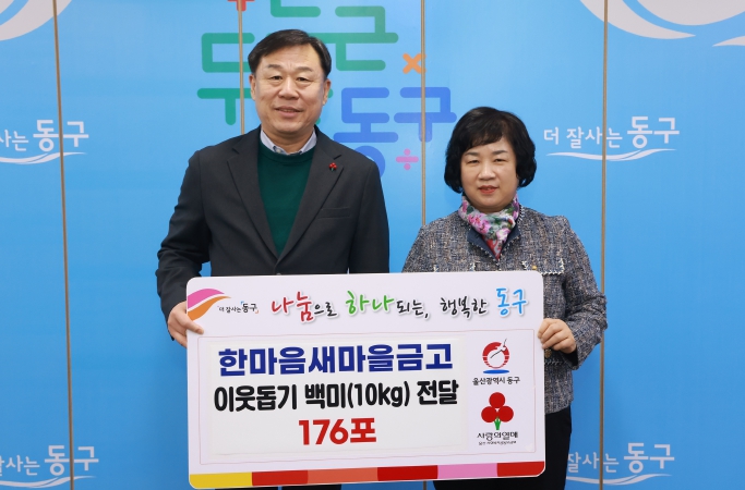 [메이저뉴스]한마음새마을금고(이사장 전숙자)는 1월 27일 오후 3시 30분 울산광역시 동구청을 찾아 ‘사랑의 좀도리 운동’으로 모은 700만원 상당의 백미(10kg) 176포대를 전달하며 지역 사회에 온기를 불어넣었다.