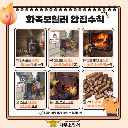 신향식 나주서장은 “화목보일러는 겨울철 따뜻함과 편리함을 제공하는 난방기기이지만 작은 부주의가 큰 화재로 이어질 수 있다”며“철저한 관리와 안전수칙 준수를 통해 안전한 겨울을 보내시길 바란다”고 말했다.