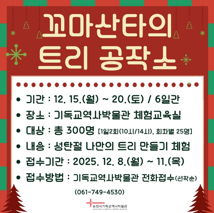 [메이저뉴스]순천시는 다가오는 성탄절을 맞아 기독교역사박물관에서 어린이와 가족이 함께 참여하는 체험 프로그램 ‘꼬마산타의 트리 공작소’를 오는 15일부터 20일까지 운영한다고 밝혔다.