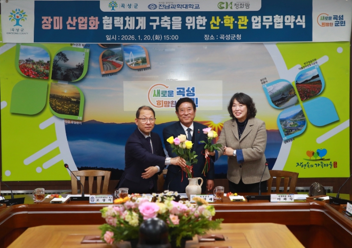 [메이저뉴스] 전남 곡성군은 장미산업화의 본격적인 추진을 위해 지난 20일 군청 소통마루에서 전남과학대학교, 주식회사 청화팜(대표 이화숙)과 함께 ‘곡성군 장미산업화 및 RISE 연계 산·학·관 협력체계 구축을 위한 업무협약’을 체결했다고 21일 밝혔다.