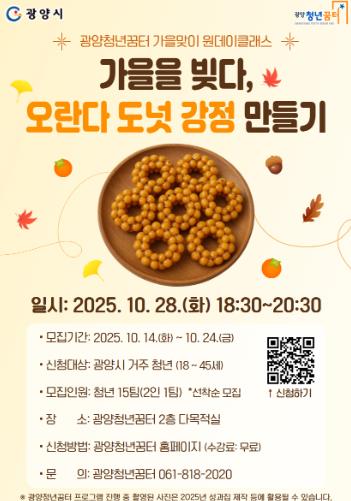 [메이저뉴스]광양시는 청년들의 여가문화 활성화와 정서적 힐링을 위한 프로그램의 일환으로, 광양청년꿈터에서 가을맞이 원데이클래스 ‘가을을 빚다 – 오란다 도넛 강정 만들기’ 참가자를 모집한다고 14일 밝혔다.