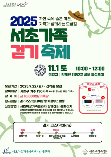 [메이저뉴스]서울 서초구는 서초여성가족플라자 방배센터, 서초구 가족센터와 함께 11월 1일 서울의 대표적인 생태하천인 양재천에서 ‘2025 서초가족 걷기 축제’를 개최한다고 밝혔다.