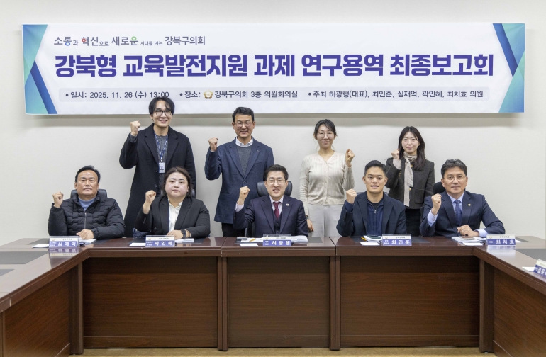 허광행 대표의원은 “이번 연구는 강북구 교육정책이 단기 지원사업 중심에서 벗어나 장기적인 방향성과 체계를 갖출 수 있도록 하는 데 의미가 있다”며 “최종보고서 내용을 집행부 정책에 반영할 수 있도록 지속적으로 협의하고, 강북구 아이들이 보다 나은 교육환경 속에서 성장하도록 의회 차원의 노력을 이어가겠다”고 말했다.
