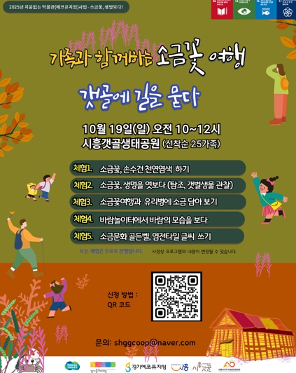 참가 신청은 홍보물에 안내된 정보무늬(큐알 코드)를 통해 온라인으로 하면 되고, 선착순 25가족을 모집한다. 모집 관련 궁금한 사항은 시흥갯골사회적협동조합로 문의하면 된다.