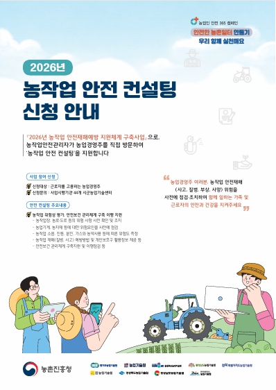 이번 컨설팅은 작년과 동일하게 농작업안전관리자가 농가를 직접 방문해 진행한다. 모든 컨설팅과 안전물품은 무료로 제공되며 컨설팅 주요내용은 △농작업이 이루어지는 작업장, 농로·도로등의 위험사항 사전 확인 및 조치△농업인이 사용하는 농업기계, 농자재 등에 대한 위험요인을 사전에 점검△농작업 중 발생하는 소음, 진동, 분진, 가스와 농약사용 등에 따른 위험도 측정 등의 상담이 이루어진다. 신청대상은 농업인안전보험 가입대상자(가입자 포함)으로 5인 내외 농작업 근로자(1순위)를 고용하거나, 농작업 종사자가 있는 농업경영주(2순위)다.