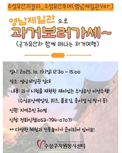 [메이저뉴스]수성구자원봉사센터 소속 수성유산지킴이는 오는 19일 영남제일관 일대에서 지역 주민을 대상으로 한 문화 체험 프로그램 ‘영남제일관으로 과거 보러 가세’를 진행한다.
