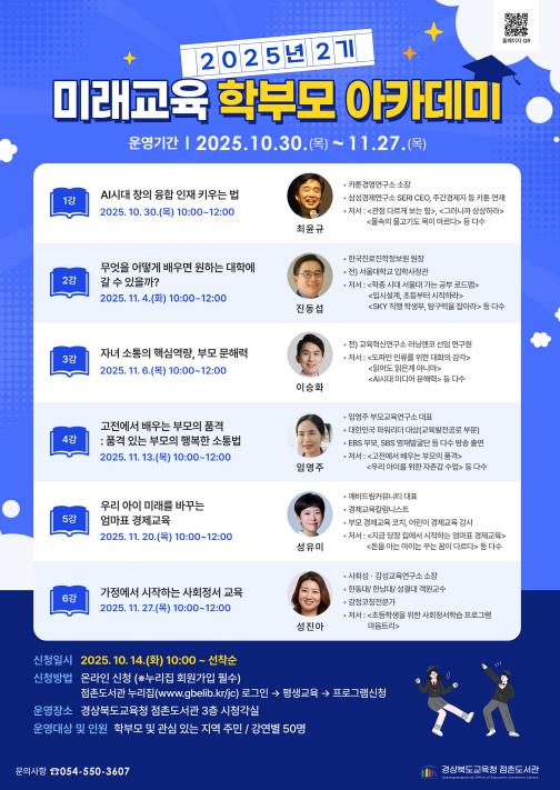 [메이저뉴스]경상북도교육청 점촌도서관은 10월 30일부터 11월 27일까지 학부모 및 일반인을 대상으로 2025년 2기'미래교육 학부모 아카데미'를 운영한다.