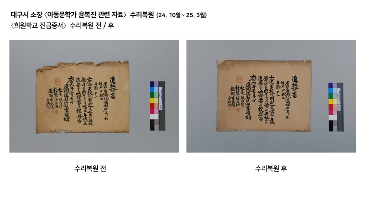 대구시(문화유산과) 소장 〈아동문학가 윤복진 관련 자료〉는 가요곡집과 졸업앨범 등 지역을 대표한 작가의 활동과 우리나라 동요사를 재조명하는 자료로 중요성을 인정받는 문화유산이었지만, 근대기 제작된 종이 수급이 어려워 수리복원에 많은 난항을 겪었다. 이에 대구간송미술관 수리복원팀은 자료와 유사한 종이를 직접 제작하여 결손부 보완 및 낙장 부분에 적용했고, 주변부와 유사한 색으로 색맞춤했다. 수리복원이 완료된 자료들은 지난 5월 대구예술발전소에서 개최된 전시 ‘수리복원, 기억을 잇다’를 통해 소개되며, 지역 출신 아동문학가 윤복진을 재조명하는 계기를 마련했다.