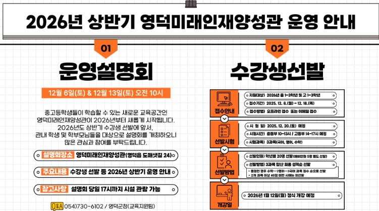 영덕미래인재양성관의 정식 개강일은 2026년 1월 12일로 예정돼 있으며, 개강 이후 정규수업, 방학․주말 특강, 컨설팅 등의 프로그램이 연중 운영돼 지역 학생들의 학습 경쟁력 향상과 교육 발전에 이바지하게 된다.