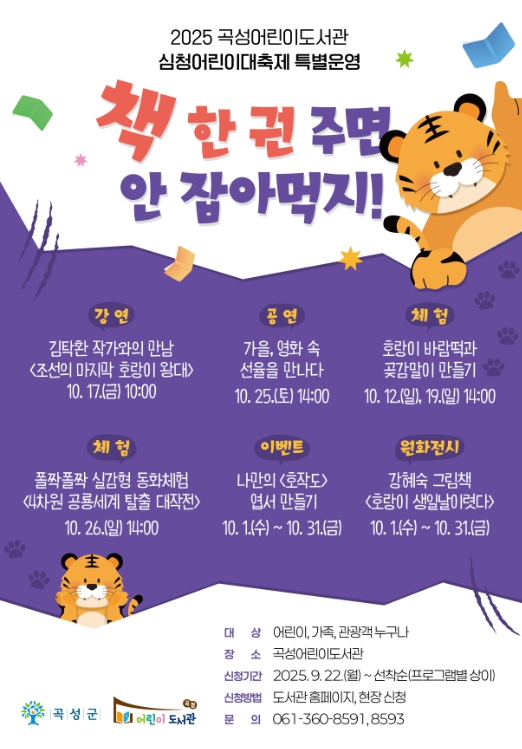 [메이저뉴스]곡성군은 다가오는 제25회 곡성심청어린이대축제를 기념하여 10월 한 달간 곡성어린이도서관에서 지역민과 방문객을 위한 다양한 볼거리와 독서문화 프로그램을 운영한다고 2일 밝혔다.
