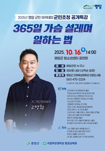 [메이저뉴스]영암군이 10월16일 오후 2시 청소년센터에 개그맨이자 방송인인 고명환 씨를 초청해 군민아카데미 제5회 공개특강을 개최한다.