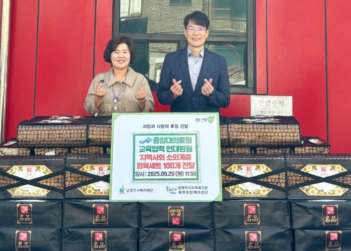 [메이저뉴스]남양주시는 지난달 29일 진접읍에 위치한 중앙대의료원 교육협력 현대병원이 추석을 앞두고 1,000만 원 상당의 정육세트 100개를 북부희망케어센터에 전달했다고 2일 밝혔다.