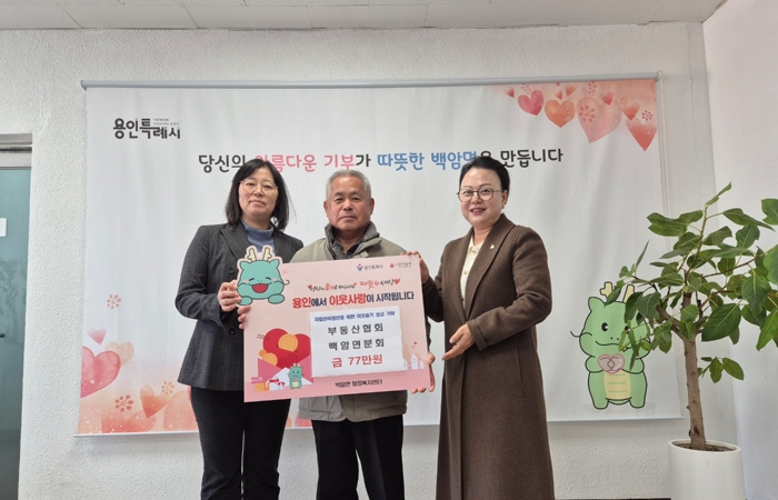 처인구 백암면 행정복지센터에는 지난 10일 공인중개사협회 백암면분회가 이웃돕기 성금 77만원을 기탁했고, 15일에는 ㈜오엠코리아가 300만원을 기탁했다.