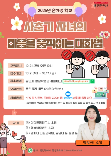 [메이저뉴스]용인특례시는 ‘사춘기 자녀 마음을 움직이는 대화법’을 주제로 한 ‘2025년 온가정 학교’ 온라인 특강 참가자를 모집한다고 2일 밝혔다.