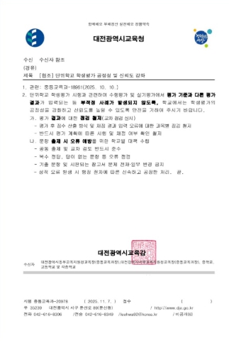 [메이저뉴스]대전시교육청은 11월 7일 단위학교의 수행평가 및 실기평가 관련 공정성을 강화하도록 전 학교에 긴급 안내했다고 밝혔다.