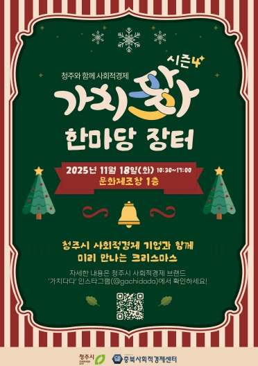 청주시가 주최하고 충북사회적경제센터가 주관하는 가운데 사회적경제기업 20개 업체가 참여해 다양한 제품과 서비스를 선보인다. 또한 ‘미리크리스마스 사회적경제 콘서트’ 등 감성적인 문화공연도 진행된다.