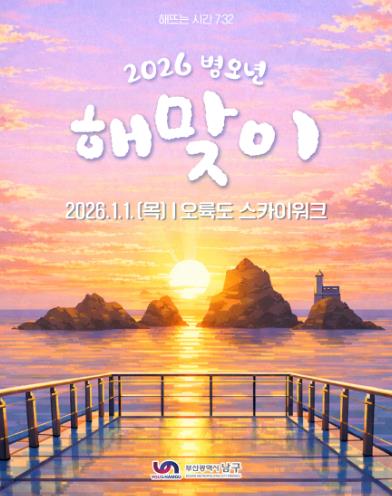 [메이저뉴스]부산 남구는 2026년 새해 첫날인 1월 1일 오전 6시 50분, 오륙도 스카이워크 광장에서 병오년 해맞이 행사를 개최한다고 밝혔다.