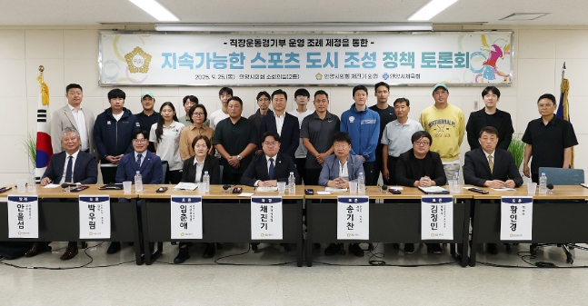 [메이저뉴스]안양시의회 채진기 의원이 주최한 ‘직장 운동경기부 운영조례 제정을 통한 지속가능한 스포츠 도시 조성 정책 토론회’가 지난 25일 안양시의회 소회의실에서 선수, 지도자, 학부모, 체육계 전문가 및 시민 40여 명이 참석한 가운데 성황리에 개최됐다.