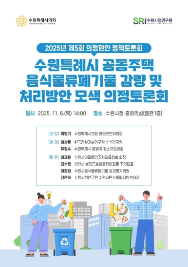 [메이저뉴스]수원특례시의회 환경안전위원회는 11월 6일, 오후 2시, 수원시청 별관 1층 중회의실에서 ‘공동주택 음식물류폐기물 감량 및 처리방안 모색을 위한 의정토론회’를 개최한다고 밝혔다.