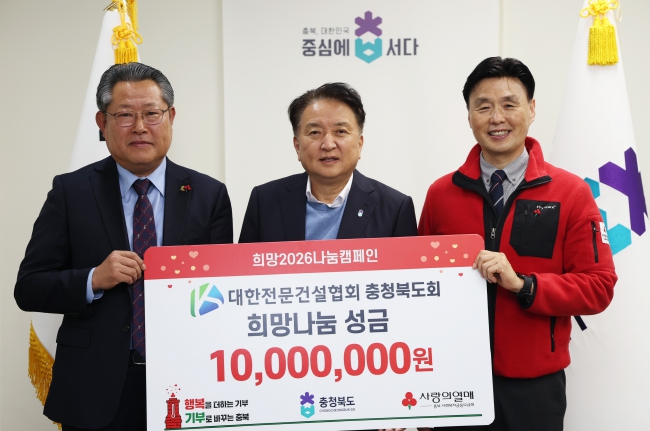 김영환 지사는 “지역 건설업계가 경기 침체 등 어려운 여건 속에서도 나눔을 실천해 주신 데 깊이 감사드린다”며 “이번 성금이 도내 소외된 이웃들에게 따뜻한 위로와 희망이 되기를 기대한다”고 밝혔다.