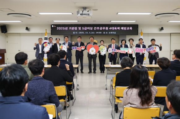 [메이저뉴스]김해시는 5일 오후 2시 시청 소회의실에서 홍태용 시장과 5급 이상 간부공무원 100여명을 대상으로 2025년 4대 폭력 예방교육을 실시했다.