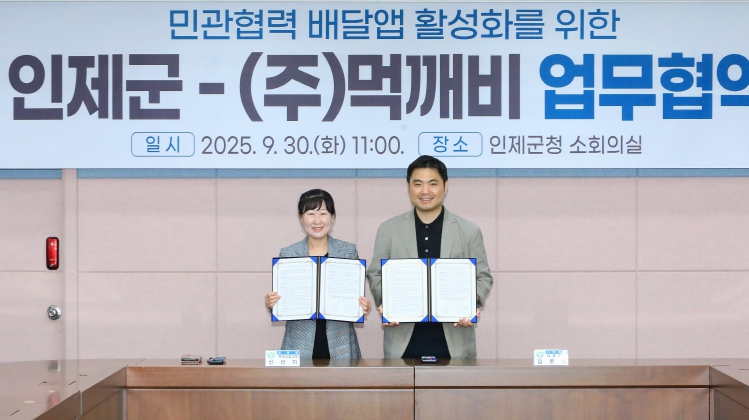 [메이저뉴스]인제군은 9월 30일 군청 소회의실에서 민관협력 배달앱 ‘먹깨비’ 운영사와 업무 협약을 체결하고, 지역 소상공인 경영 안정과 군민 편익 증진을 위한 본격적인 협력에 나섰다.