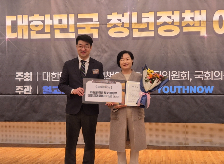 [메이저뉴스]화순군은 23일 국회도서관 대강당에서 열린 ‘2025 대한민국 청년정책 어워즈’에서 청년 및 신혼부부 만원임대주택 정책으로 ‘혁신상’을 수상했다고 밝혔다.