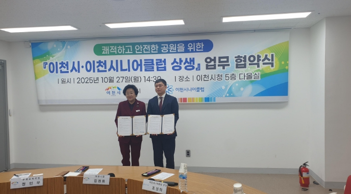 [메이저뉴스]이천시는 10월 27일 이천시니어클럽과 ‘쾌적하고 안전한 공원을 위한 상생 업무협약(MOU)’을 체결했다. 이번 협약은 공원 환경정화와 안전관리 강화를 위해 민관이 협력체계를 구축하고, 어르신의 사회참여와 일자리 확대를 지원하기 위해 추진됐다.