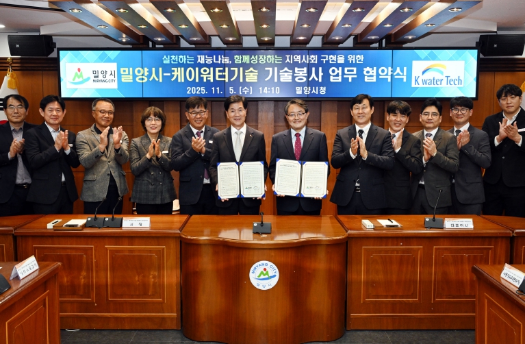 [메이저뉴스]경남 밀양시와 케이워터기술(주)(대표 정승용)은 5일 시청 소회의실에서 ‘실천하는 재능나눔, 함께 성장하는 지역사회 구현을 위한 기술봉사 업무협약’을 체결했다고 밝혔다.