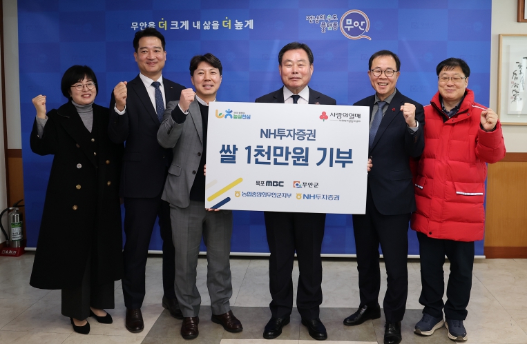 이날 기탁식에는 김산 군수를 비롯해 NH투자증권 전민경 이사, 목포MBC 김순규 대표이사, NH농협 무안군지부 박상덕 지부장, 전남사회복지공동모금회 오세헌 부장 등 관계자들이 참석해 지역사회 이웃사랑 나눔의 의미를 함께 했다.