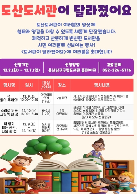 [메이저뉴스] 울산 남구 도산도서관은 부분 리모델링을 통해 한층 더 쾌적하고 편안한 독서환경을 조성하고 시민들이 책과 문화를 함께 즐길 수 있는 열린 공간으로 거듭나 이를 기념하는 ‘도산도서관이 달라졌어요’ 행사를 9일부터 14일까지 운영한다고 밝혔다.