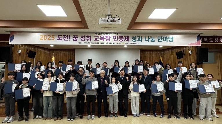 [메이저뉴스]경상북도 성주교육지원청은 12월 9일, 성주교육지원청 대회의실에서 관내 초, 중학생 중 금장 인증 학생과 인솔 교사, 운영위원 등 55명이 참여한 가운데 2025년 도전! 꿈 성취 교육장 인증제 성과 나눔 한마당을 개최했다.