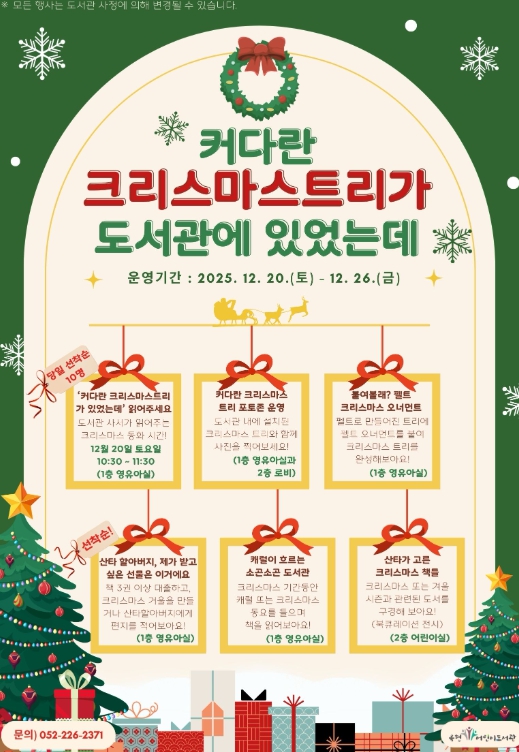 [메이저뉴스]울산 남구 옥현어린이도서관은 연말 크리스마스를 맞아 20일부터 26일까지 어린이와 가족이 함께 즐길 수 있는 독서문화행사 ‘커다란 크리스마스트리가 도서관에 있었는데’를 운영한다.