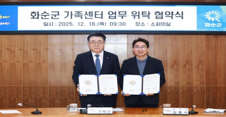 [메이저뉴스]화순군은 18일 화순군청 소회의실에서 (사)다사랑건강가정복지협회(회장 김종식)와 화순군 가족센터 업무 위탁 협약을 체결하고, 가족 지원 정책의 안정적 추진과 지역사회 돌봄 기반 확충에 나섰다고 밝혔다.