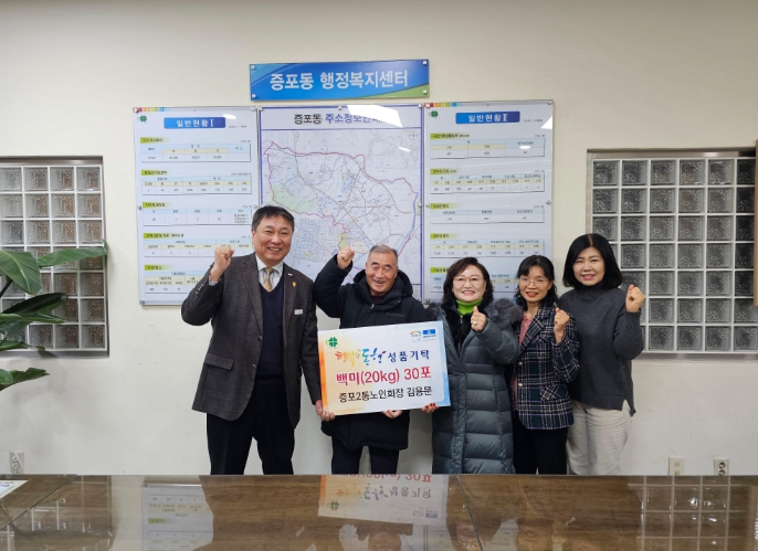 한편, 이날 기탁된 백미 30포는 증포동행정복지센터를 통해 관내 저소득층 가정에 전달될 예정이다.