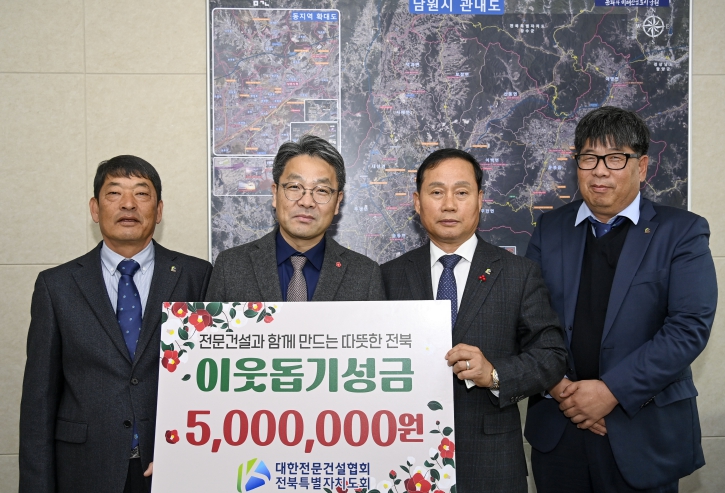 [메이저뉴스]남원시는 12월 19일 대한전문건설협회 전북도회(회장 임근홍)와 남원지회(회장 김재주)가 '희망2026 나눔 캠페인'에 동참하며 500만 원의 성금을 기탁했다고 밝혔다.
