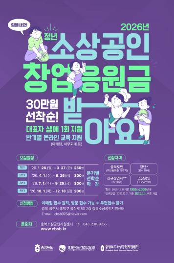 [메이저뉴스]충북도와 (재)충청북도기업진흥원(소상공인지원센터)이 ‘2026년 청년 소상공인 창업응원금 지원사업’의 1분기 참여자 250명을 1월 26일부터 오는 3월 27일까지 선착순으로 모집한다.