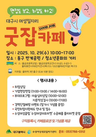 [메이저뉴스]대구광역시는 경력단절 및 미취업 여성을 위한 찾아가는 여성일자리 ‘굿잡(Good Job)’ 9차·10차 행사를 10월 28일부터 29일까지 이틀간 진행한다.